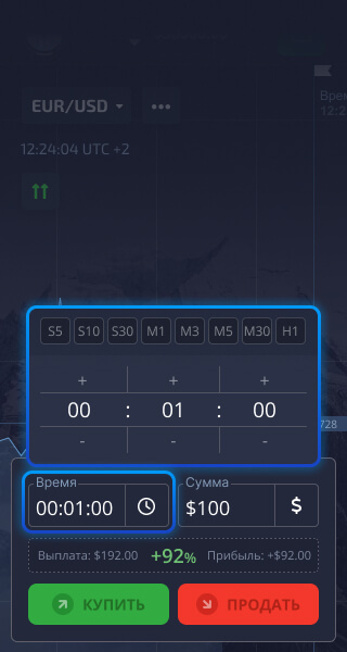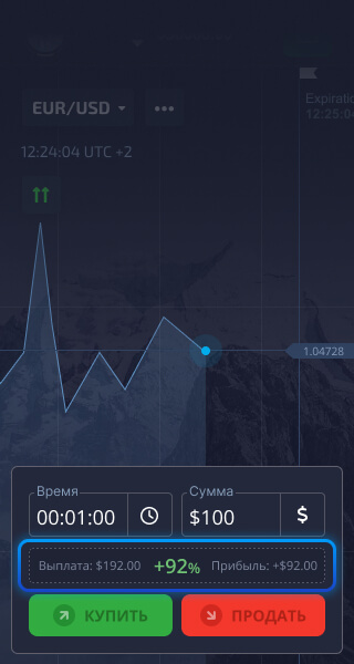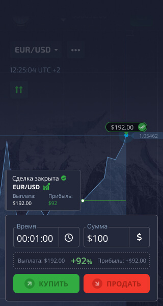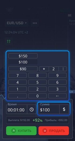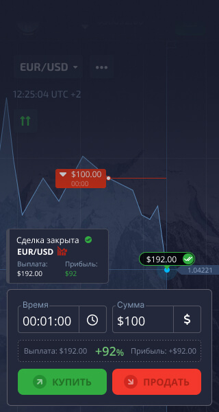 Нажмите кнопку "Купить" или "Продать", если вы считаете, что цена актива будет расти или, соответственно, падать.